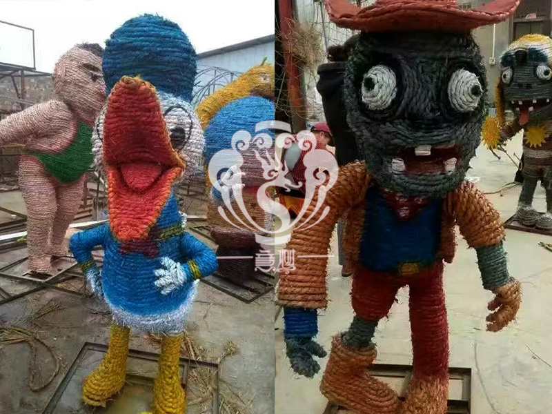 現在的精致稻草人藝術通常是由專業美術老師的造型放樣,然后由焊工師傅焊接出立體造型造型,然后以稻草或者稻草繩為材料編捆制作而成。