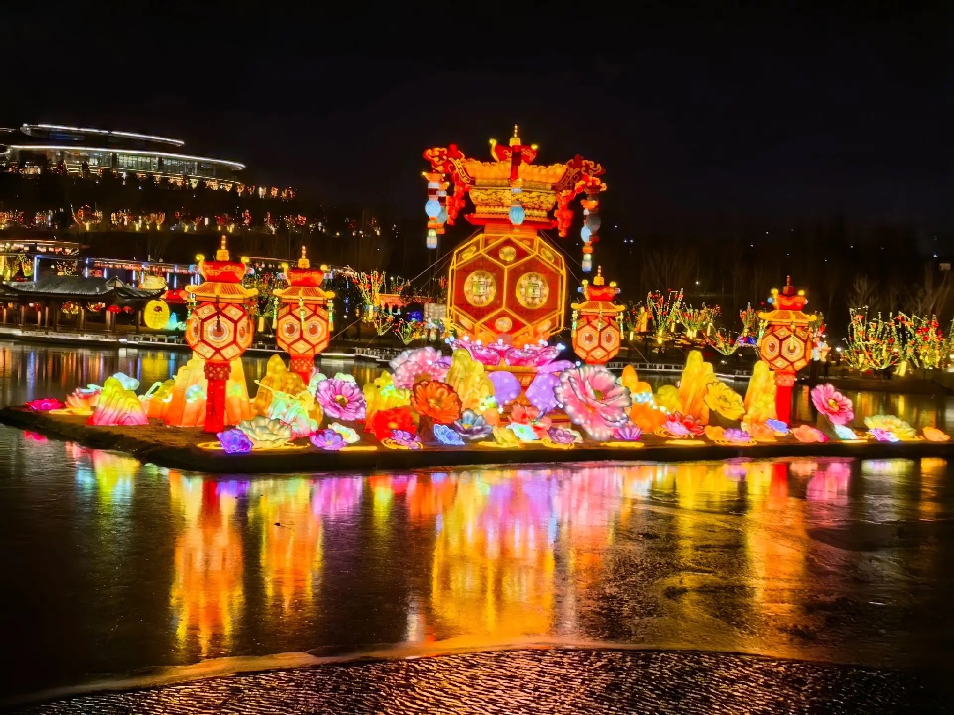 燈展現(xiàn)場(chǎng),千燈萬盞與龍馬湖的山、水、橋景相映成趣,構(gòu)筑成一幅絕美的新春光影畫卷。高達(dá)十二米的“富貴平安”燈組喜慶洋溢,五顏六色的牡丹花團(tuán)錦簇,成為全場(chǎng)焦點(diǎn);